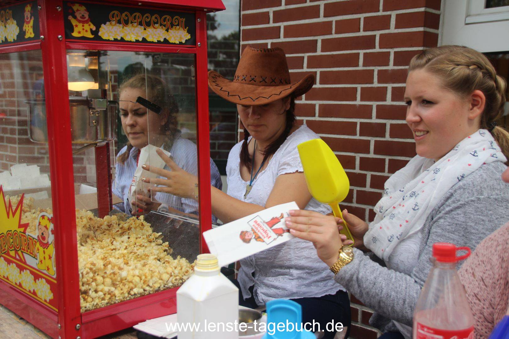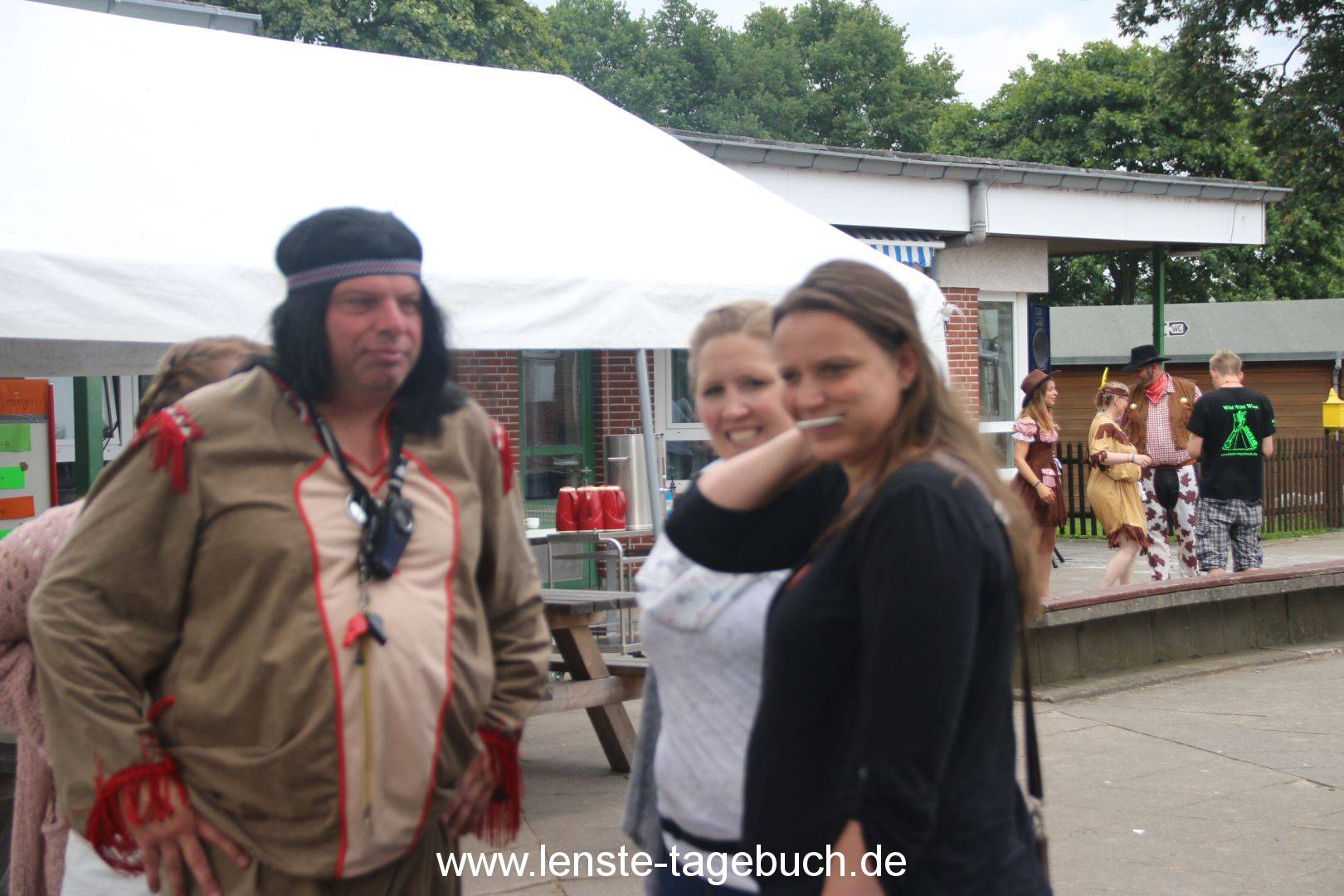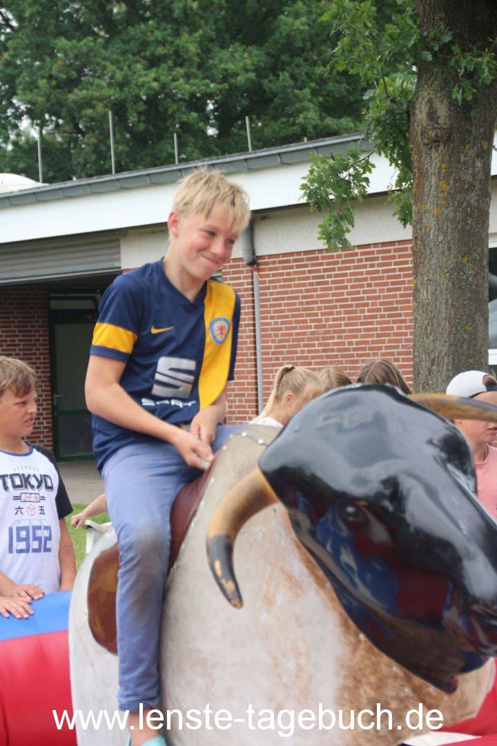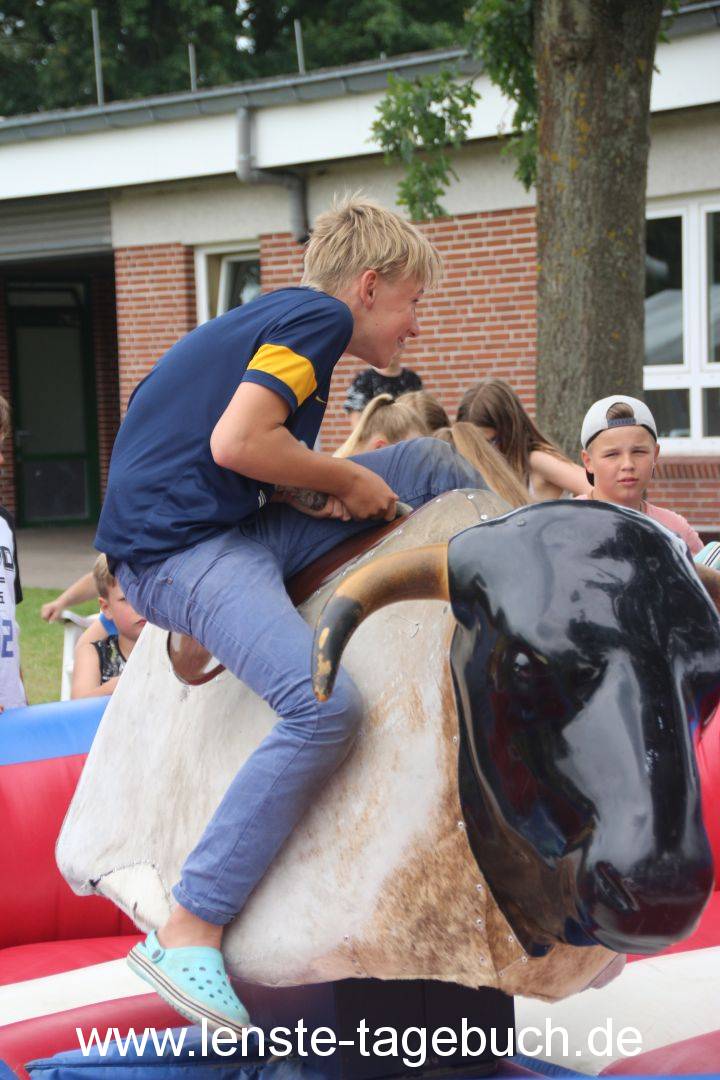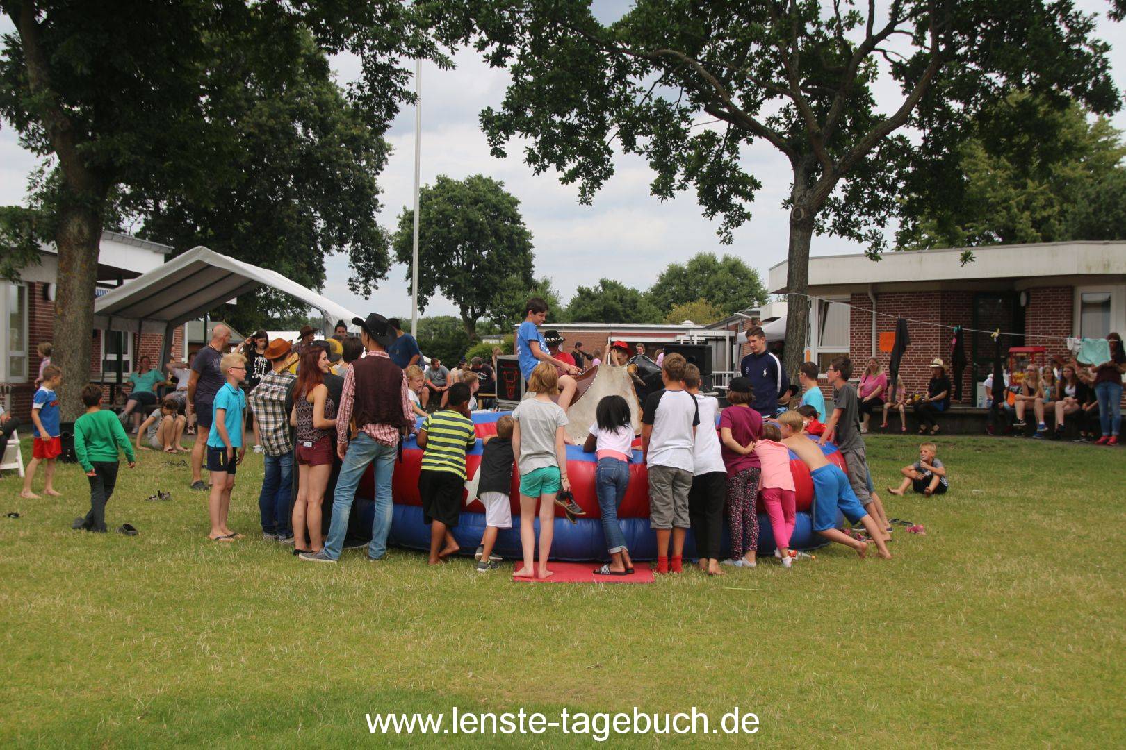 Nach dem Mittagessen beginnt dann der Budenzauber (wie das im Wilden Westen richtig genannt wird, konnte ich leider nicht ermitteln), zu dem wir uns diesmal ein paar ganz besondere Attraktionen ausgedacht haben. Neben Bogenschießen, einer Hüpfburg, Hufeisenwerfen und Lasso-Werfen ist das Highlight des Tages das Bullenreiten! Sehr viele von uns wagen es, sich auf den Bullen zu setzen und versuchen, ihn zu bezwingen.