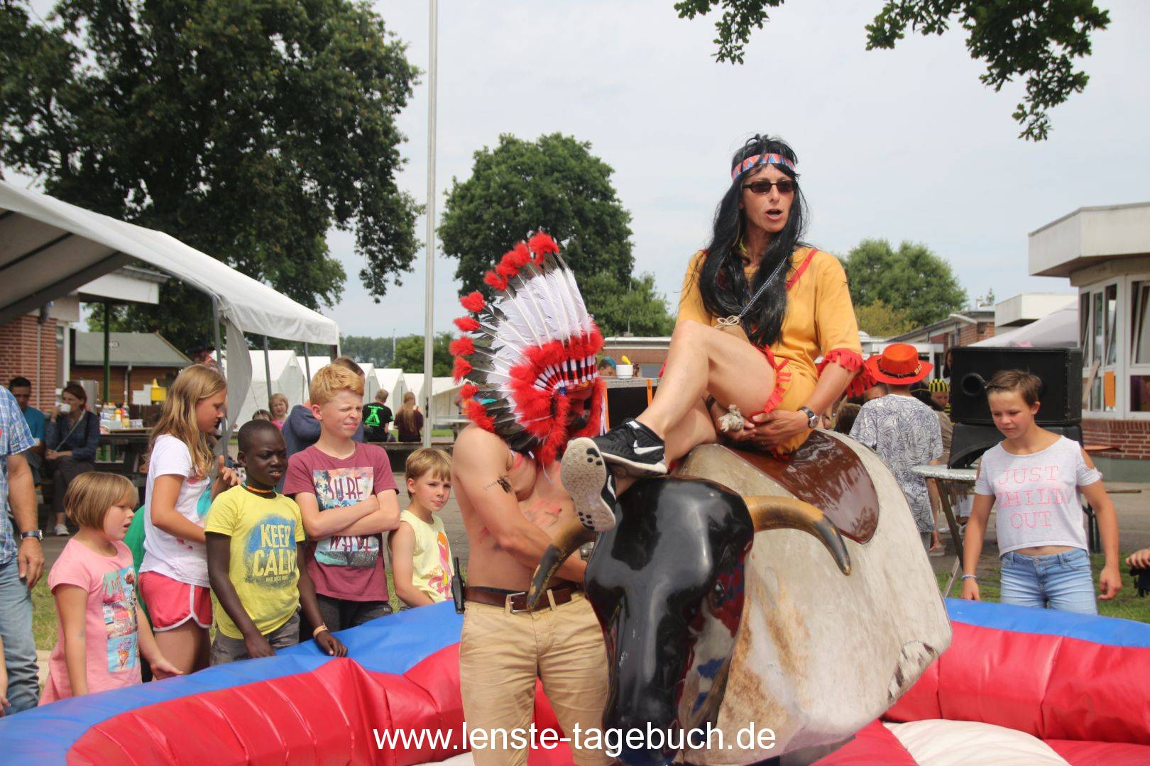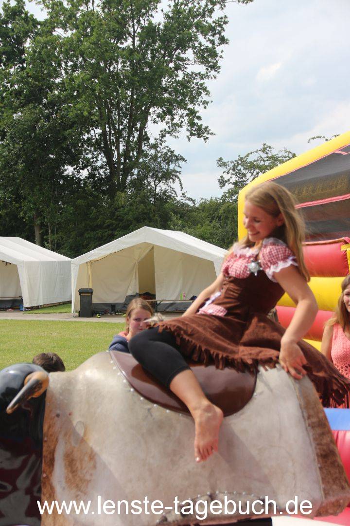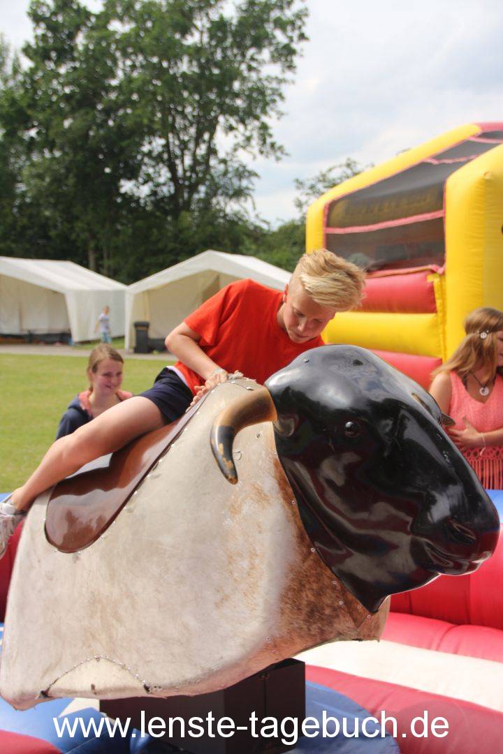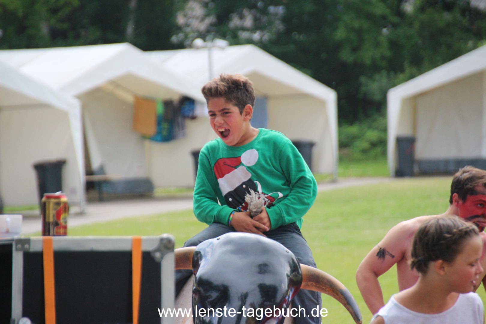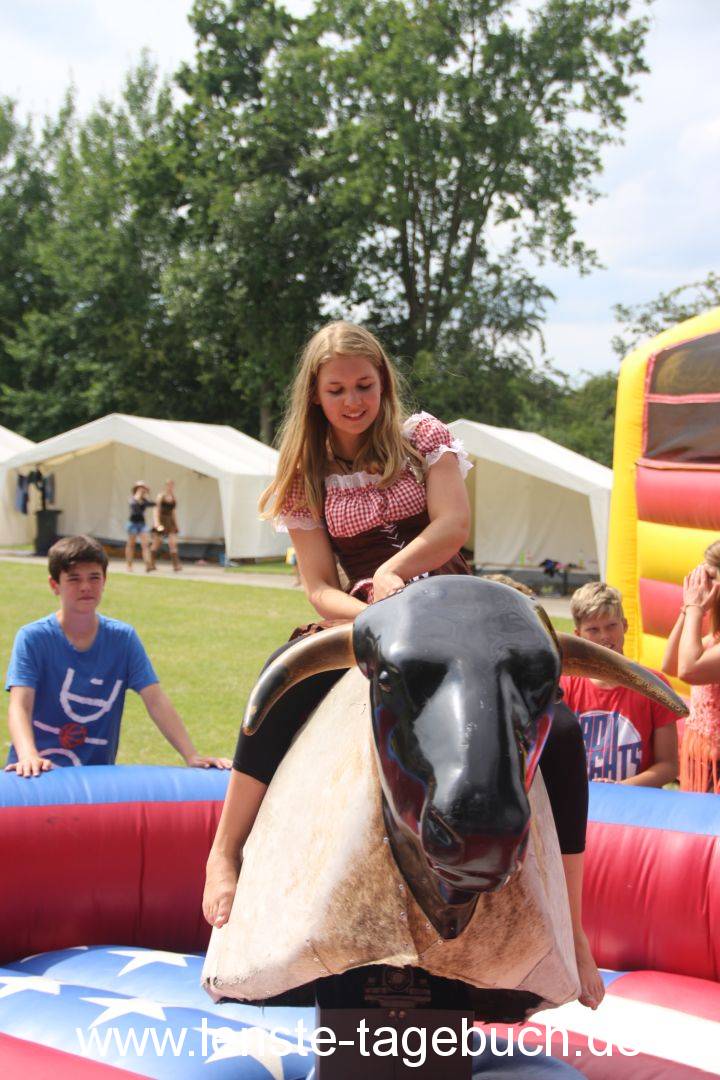 Nach dem Mittagessen beginnt dann der Budenzauber (wie das im Wilden Westen richtig genannt wird, konnte ich leider nicht ermitteln), zu dem wir uns diesmal ein paar ganz besondere Attraktionen ausgedacht haben. Neben Bogenschießen, einer Hüpfburg, Hufeisenwerfen und Lasso-Werfen ist das Highlight des Tages das Bullenreiten! Sehr viele von uns wagen es, sich auf den Bullen zu setzen und versuchen, ihn zu bezwingen.