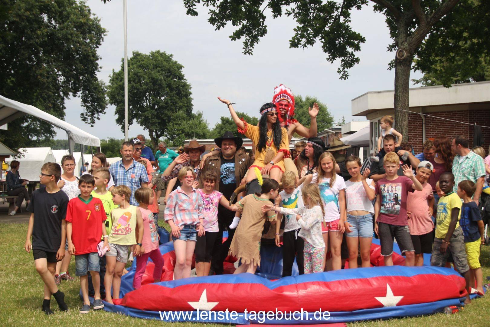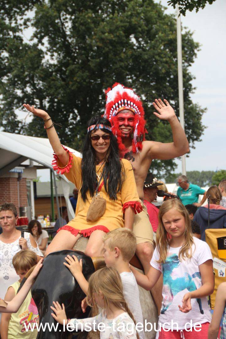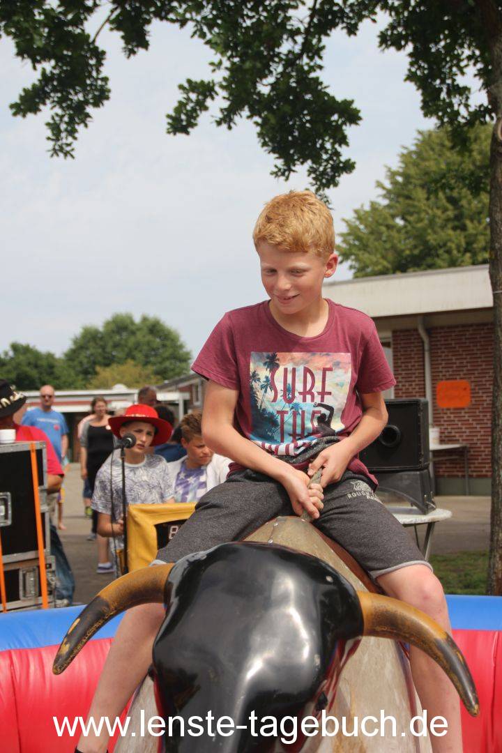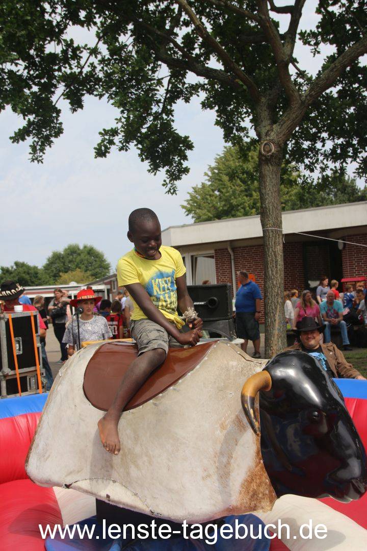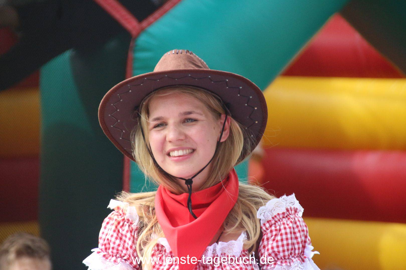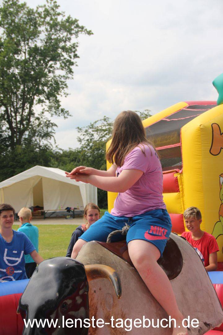 Nach dem Mittagessen beginnt dann der Budenzauber (wie das im Wilden Westen richtig genannt wird, konnte ich leider nicht ermitteln), zu dem wir uns diesmal ein paar ganz besondere Attraktionen ausgedacht haben. Neben Bogenschießen, einer Hüpfburg, Hufeisenwerfen und Lasso-Werfen ist das Highlight des Tages das Bullenreiten! Sehr viele von uns wagen es, sich auf den Bullen zu setzen und versuchen, ihn zu bezwingen.