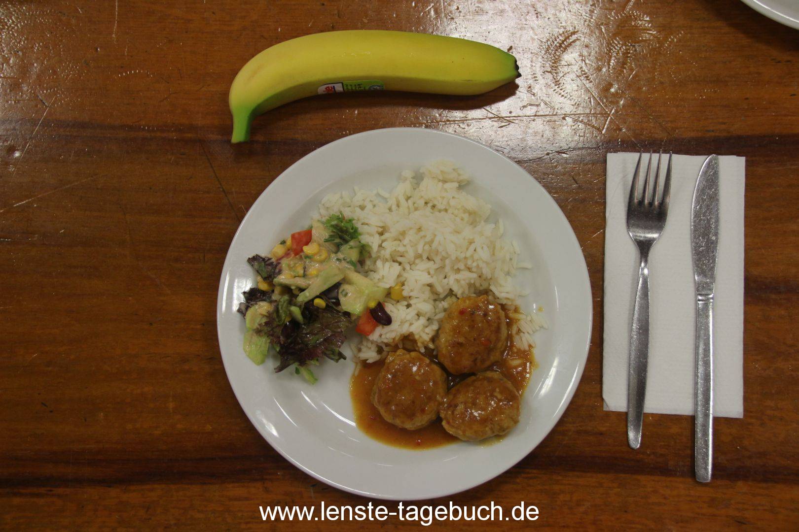 Mittagessen: Mini-Frikadellen in Paprika-Orangensoße, dazu Reis. Zum Nachtisch Banane