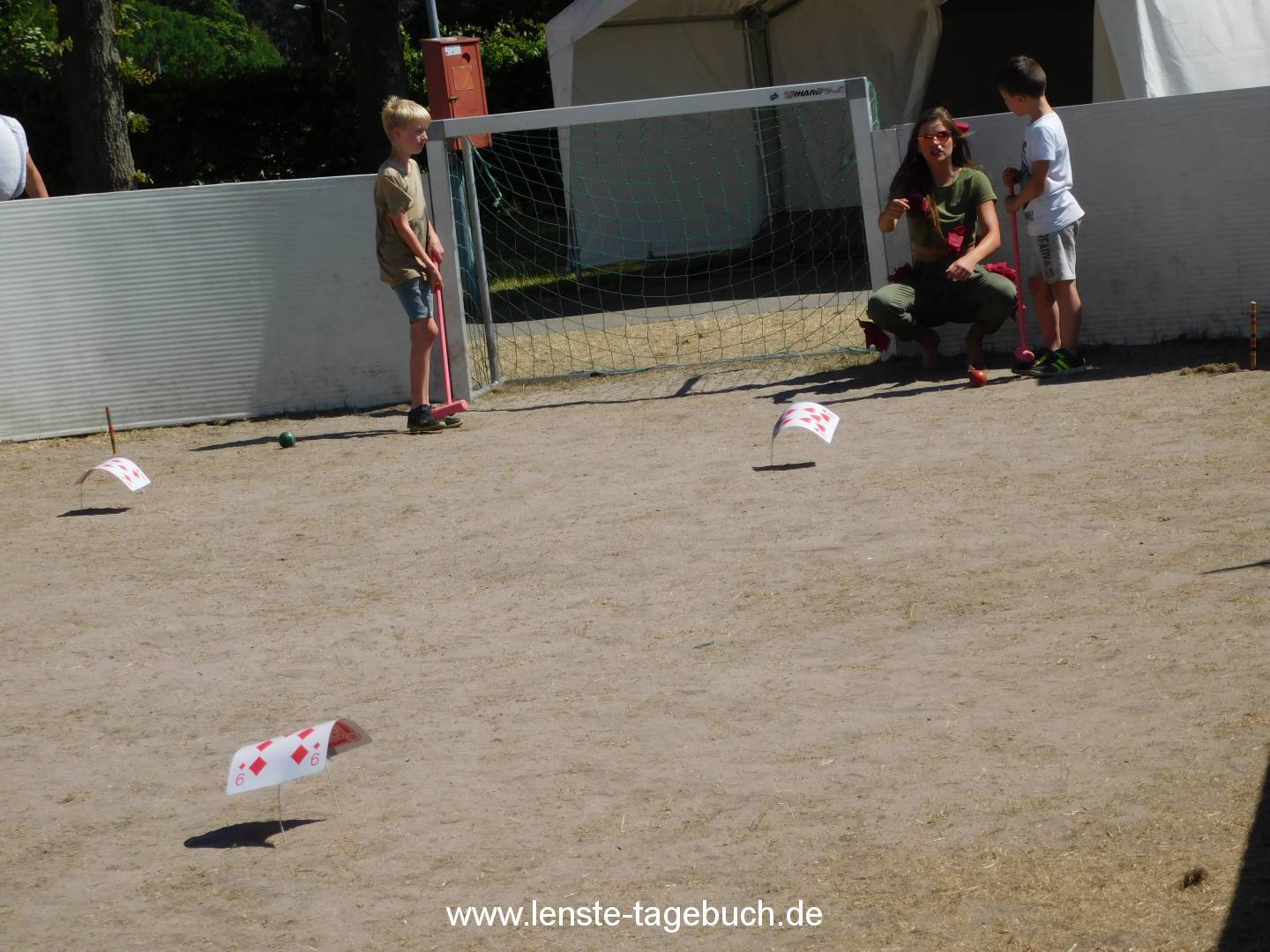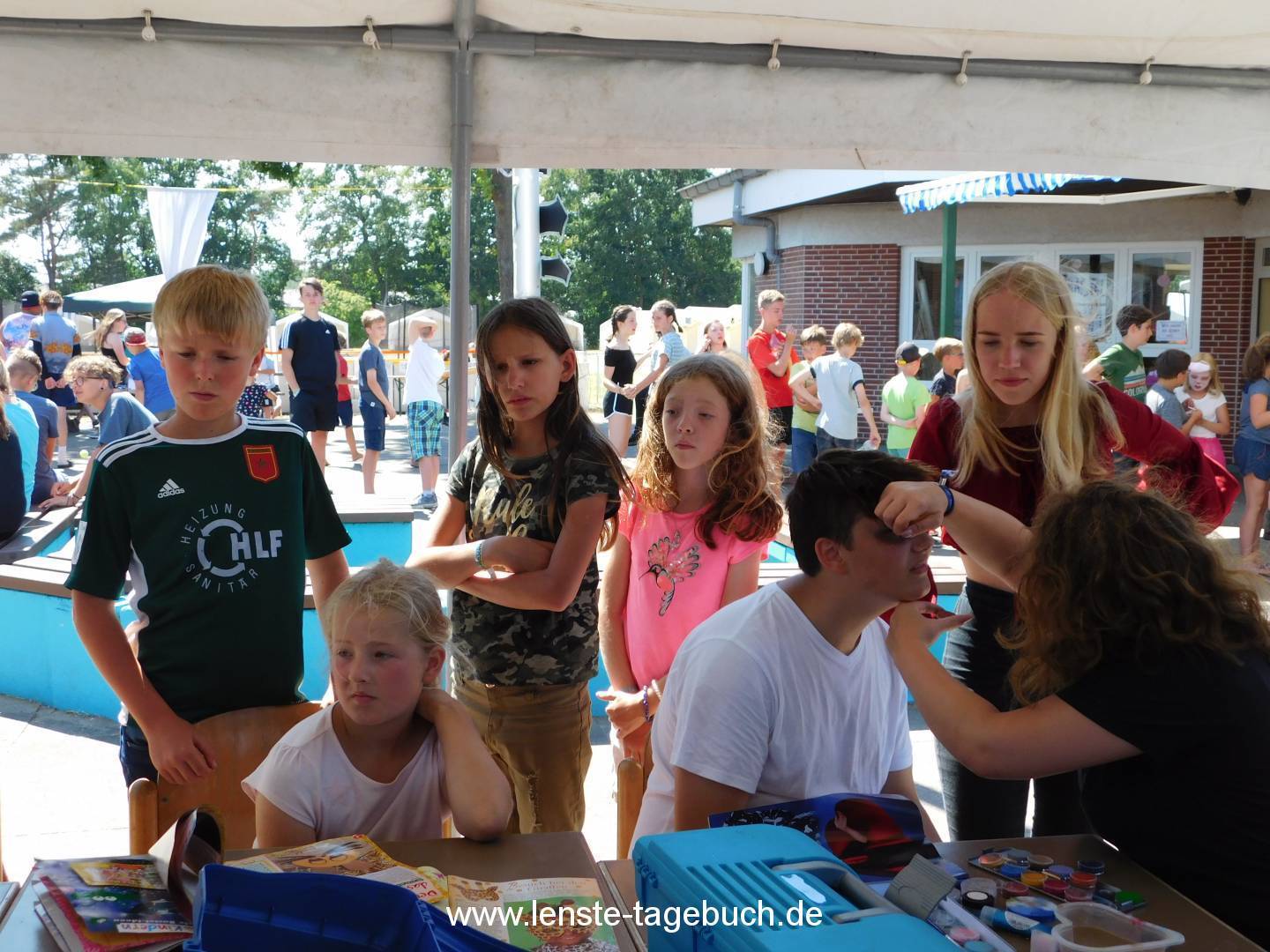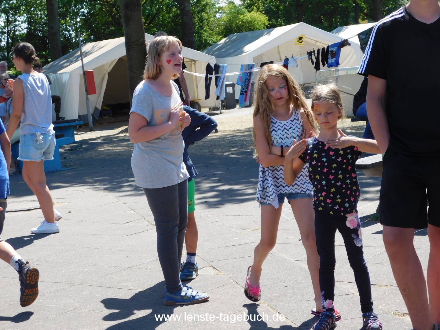 Heute war der Tag des offenen Lagers, das heißt, Familie und Freunde konnten einmal einen Blick in unseren Zeltlageralltag werfen. Dazu fand am Nachmittag unser großer Budenzauber statt. Dieser wurde mit 200 Ballons eröffnet, die genn Himmel stiegen. Die Familien und Kinder konnten Waffeln, Zuckerwatte und Bratwurst essen. Die Kalorien konnten auf der Hüpfburg, Bungeerun oder beim Eierlauf und Torschießen verbrannt werden. Weiter tolle Stationen waren Buttons- und Kartenbasteln, Kinderschminken, Flamingo-Crocket und Wege legen. Bei super Wetter und toller Musik der DJ’s war dies ein wunderbarer Nachmittag. Der Budenzauber wurde abgerundet mit einer Vorstellung eines Zauberers. Anschließend an diese faszinierende Vorstellung konnten die Kinder selber noch einen Zaubertrick erlernen.