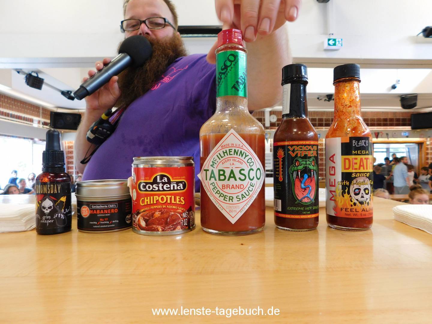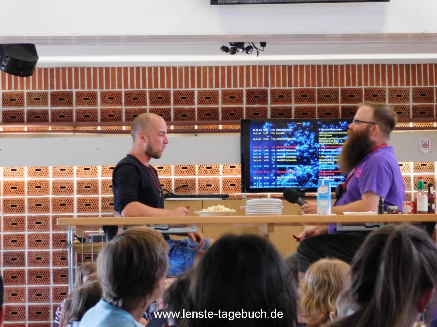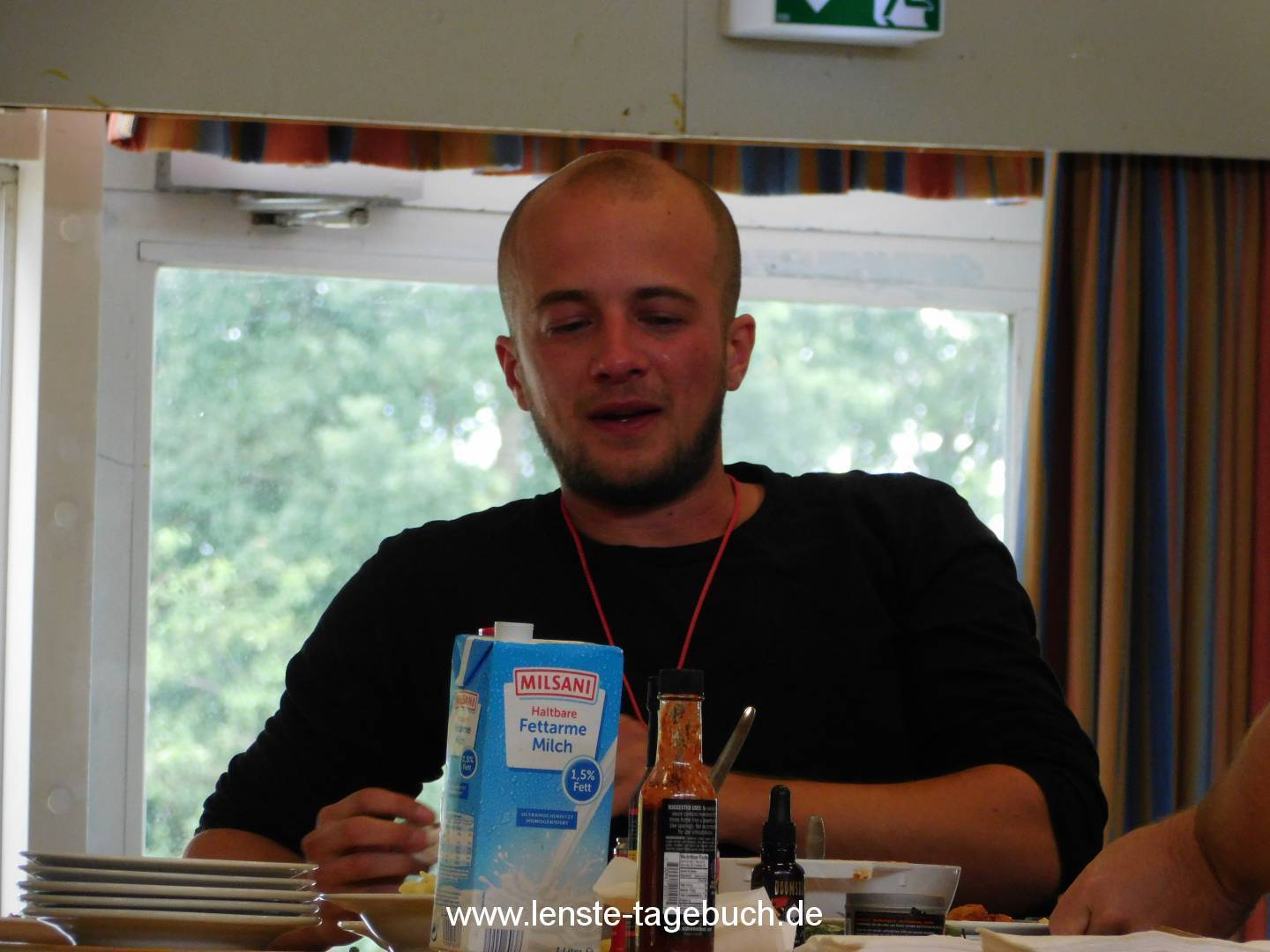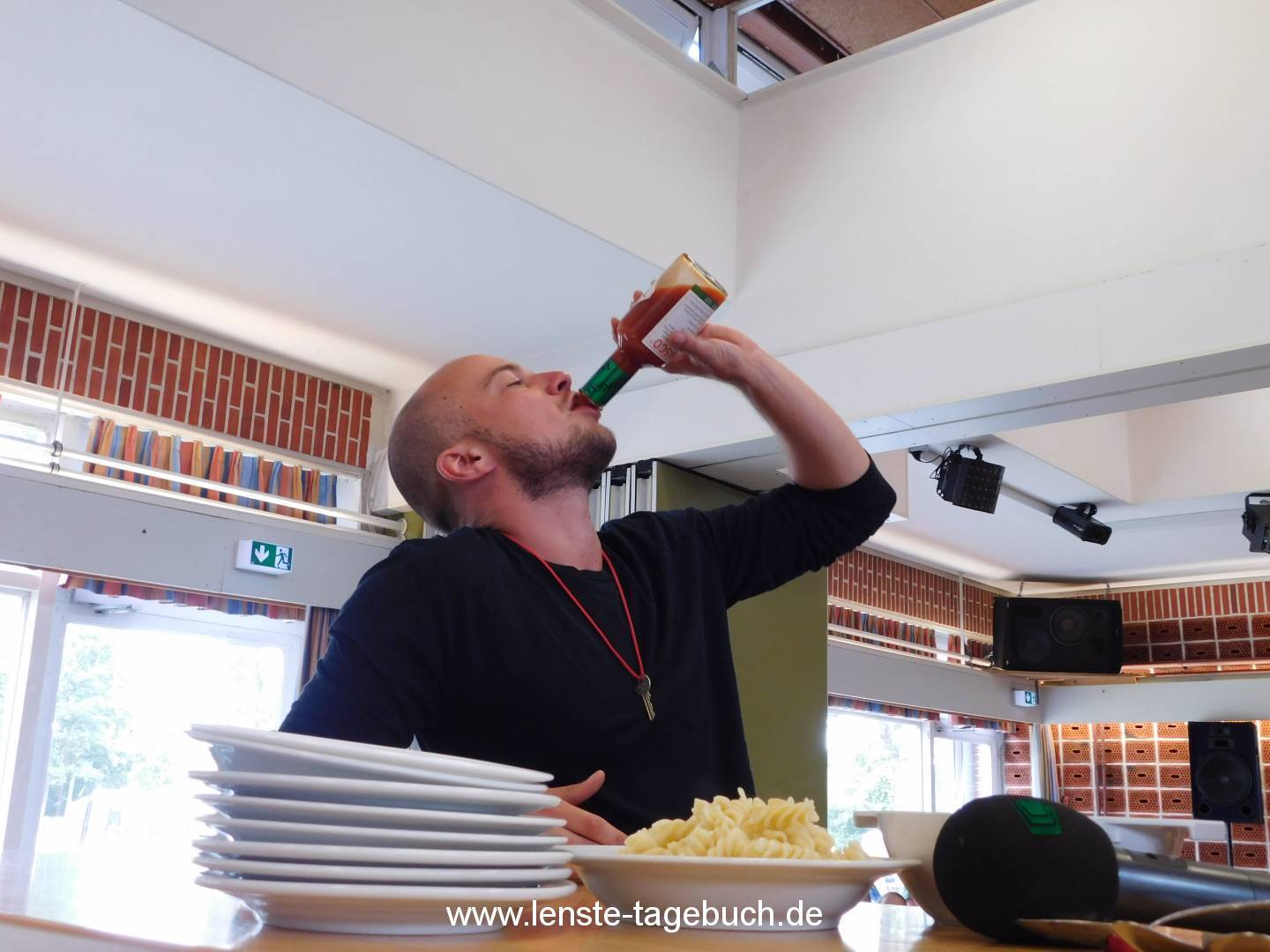 Zum Mittagessen gab es Nudeln mit Tomatensoße und Fleischklößchen. Während des Mittagessens gab es eine ausgelassene Stimmung, da zwei Betreuer ein Schärfewettessen veranstalteten.
